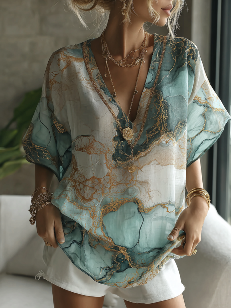 Vintage Marble Texture Collection Bohemia Women Style Gradient Black Gilded Pattern Linen V Neck T-shirt