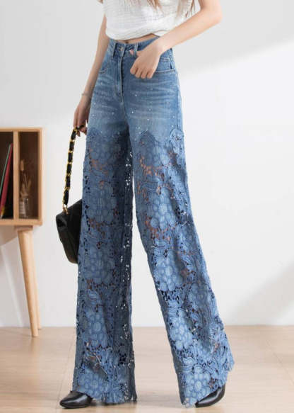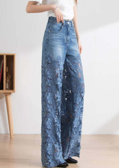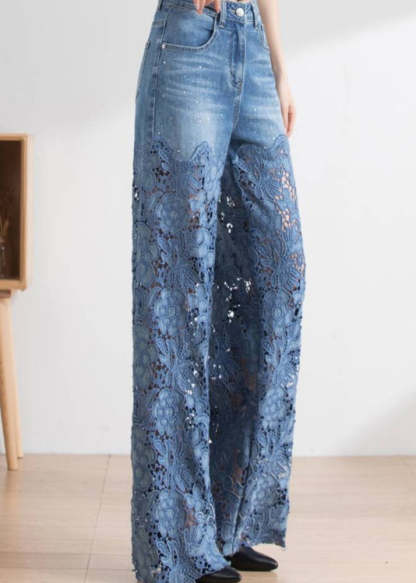 Vogue Blue Lace Patchwork Hollow Out High Waist Denim Pants