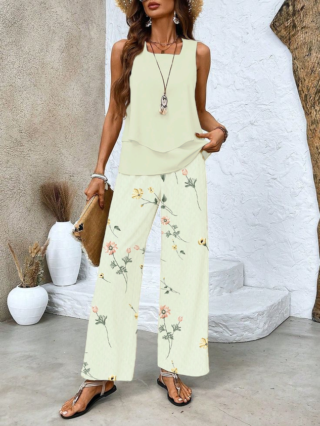 Women Floral Printing Two-Piece Set Daily Sleeveless Casual Summer Top With Pants Matching Set