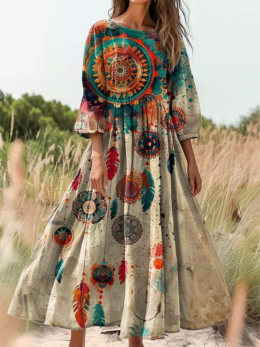 Women's Boho Ethnic Mandala Art Print Flowy Cotton Crew Neck Dress