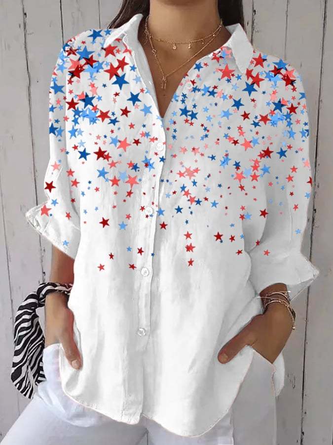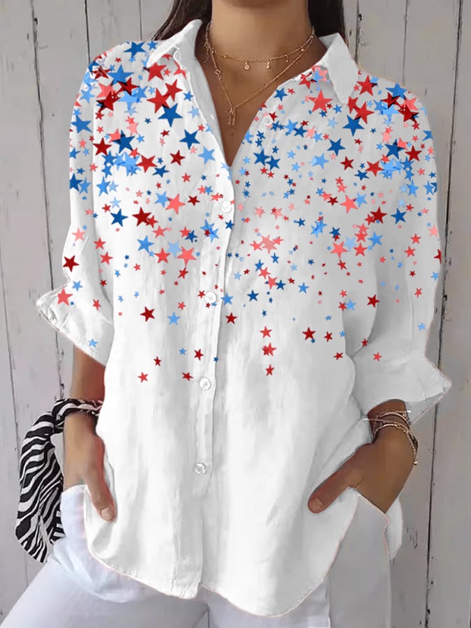 Women's Casual Cotton and Linen Floral Independence Day Shirt