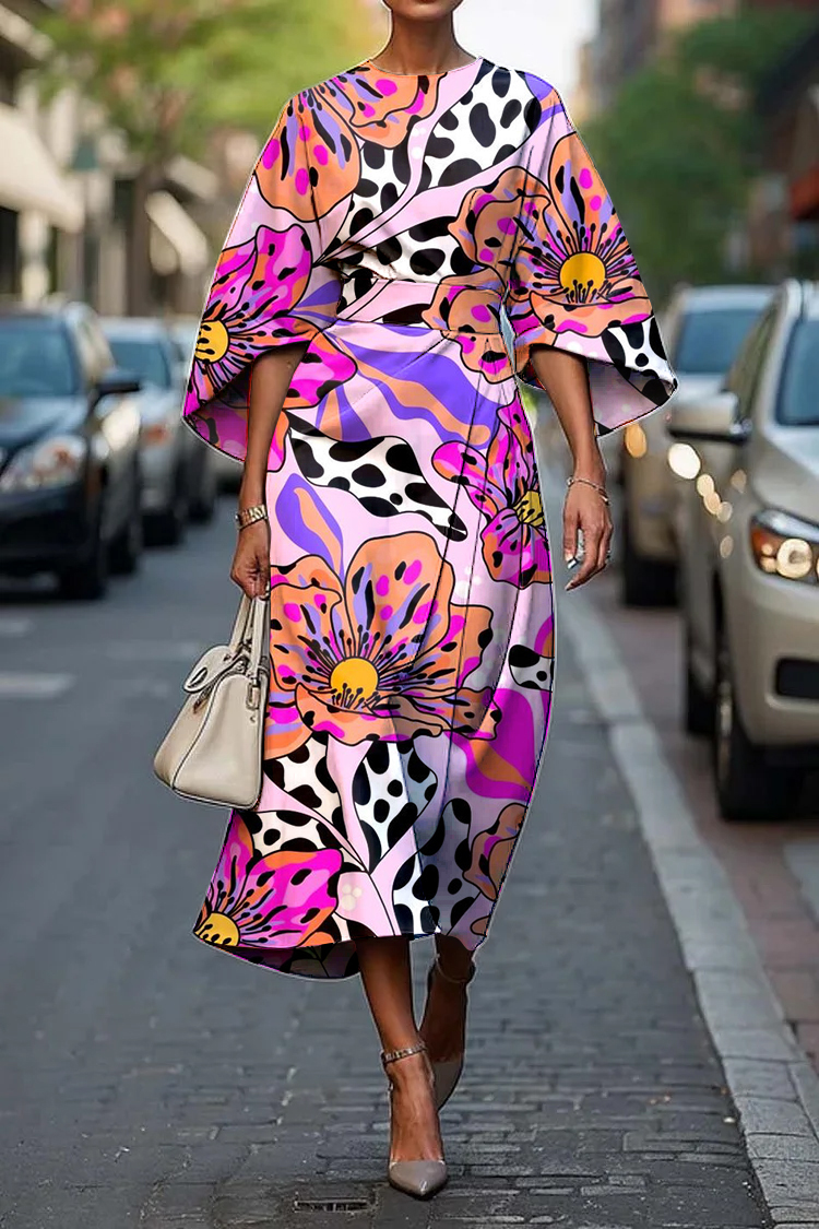 Women's Elegant Floral Art Print Midi Dress