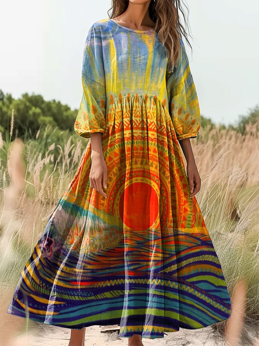 Women's Hippie Sun Sunrise Art Print Flowy Cotton Crew Neck Dress