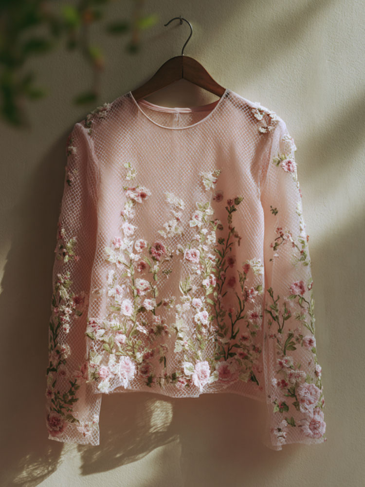 Women's Pink Floral Pink Embroidery Print T-shirt