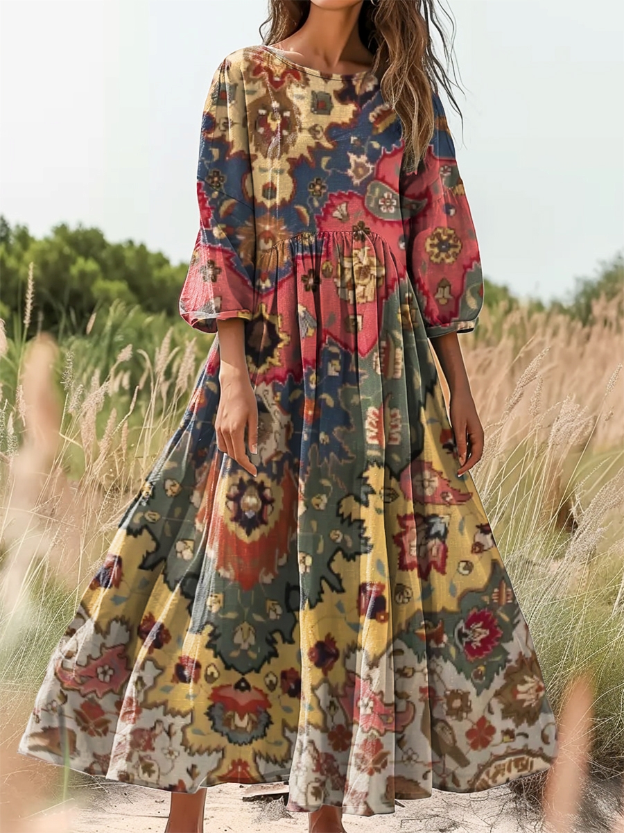 Women's Retro Boho Ethnic Collage Print Flowy Cotton Crew Neck Dress