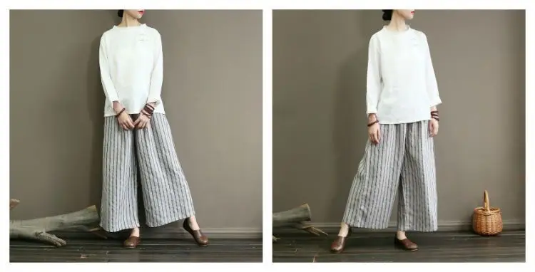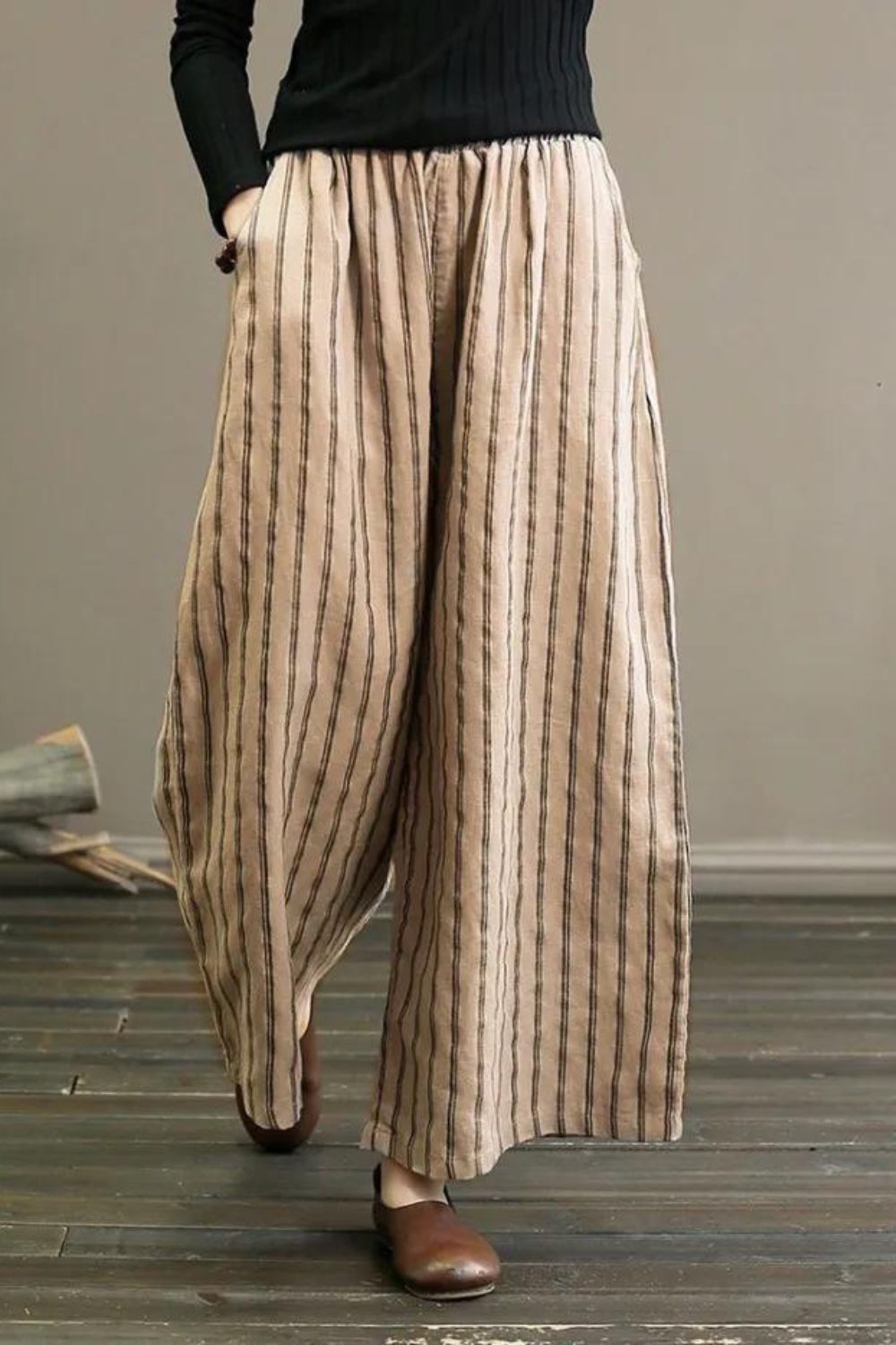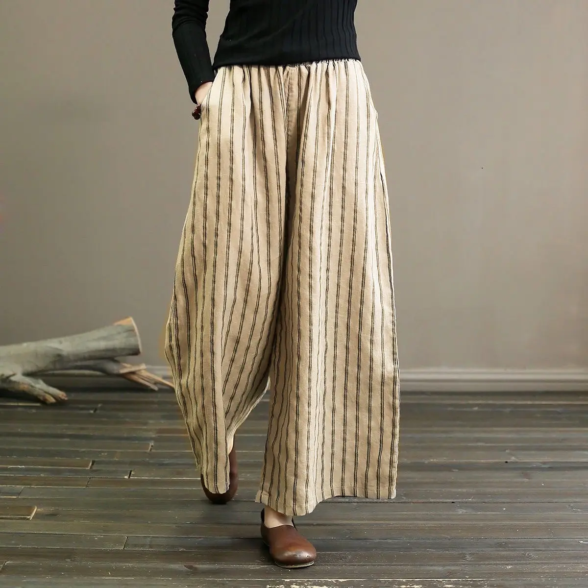 Women's Retro Striped High Waist Straight Printed Cotton Linen Slim Home Pants