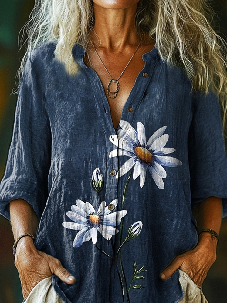 Women's Vintage Daisy Flowers Art Print Casual Cotton Linen Shirt