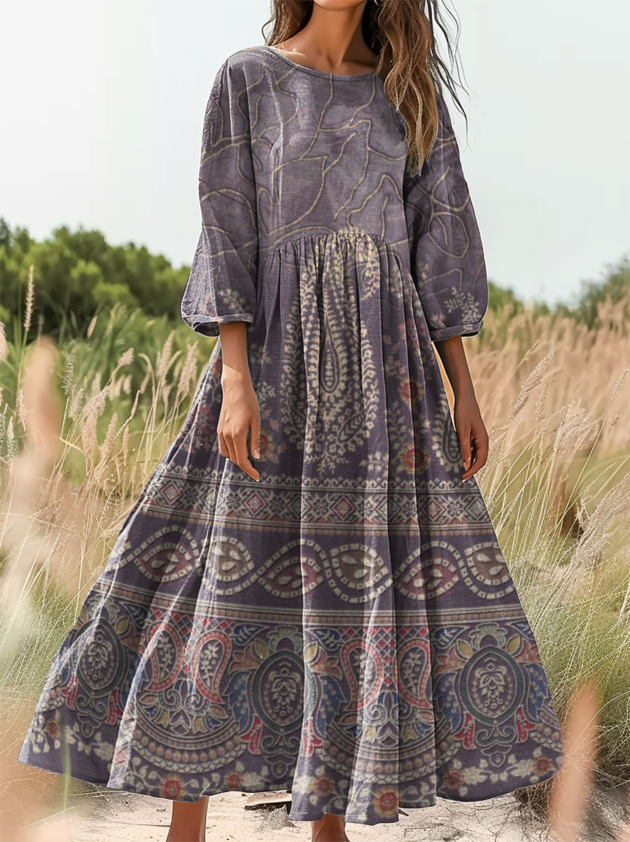Women's Vintage Ethnic Paisley Collage Print Flowy Cotton Crew Neck Dress