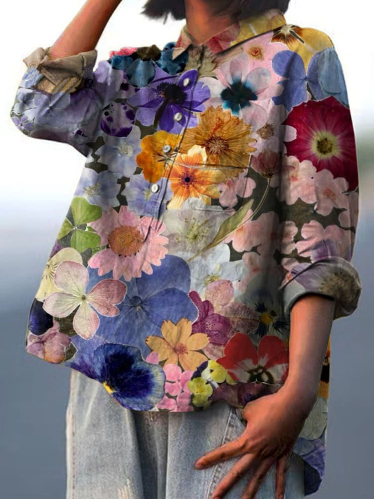 Women's Vintage Floral Art Print Casual Cotton And Linen Shirt