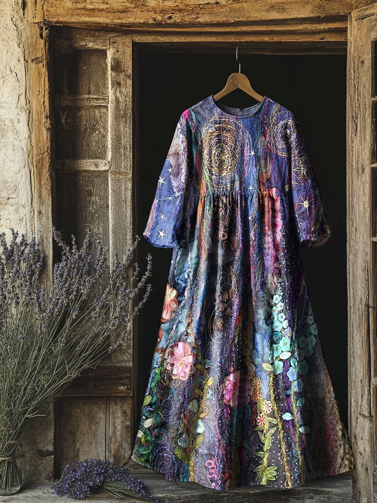 Women's Vintage Floral Print Flowy Cotton Crew Neck Dress