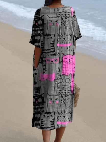Women's Vintage Lovely Cats Art Print Flowy Dress