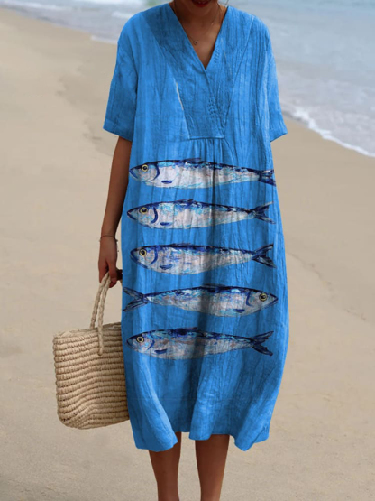 Women's Vintage Lovely Fish Art Print Flowy Dress