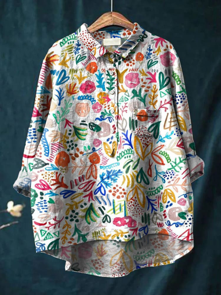 Women's Watercolor Leaves Flower Art Print Casual Cotton And Linen Shirt