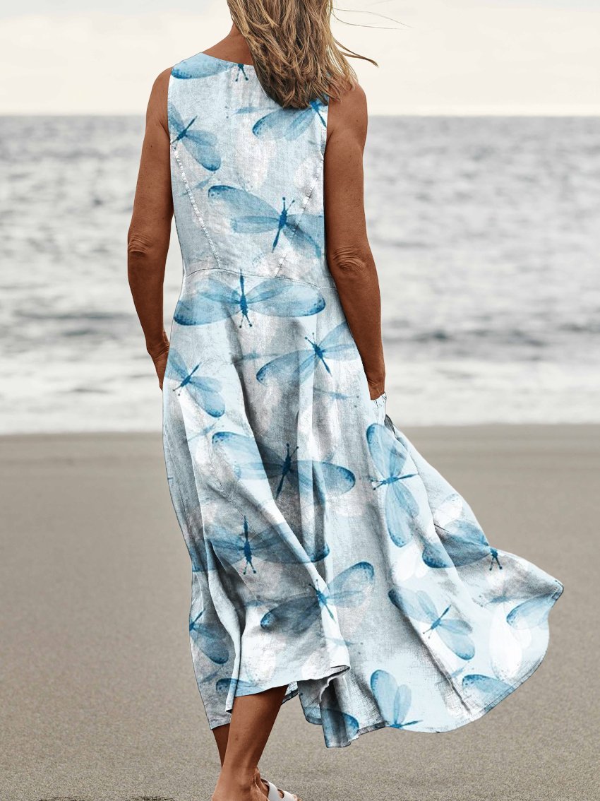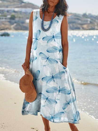 Blue Dragonfly Print Womens Pocket Pinafore Linen Dress