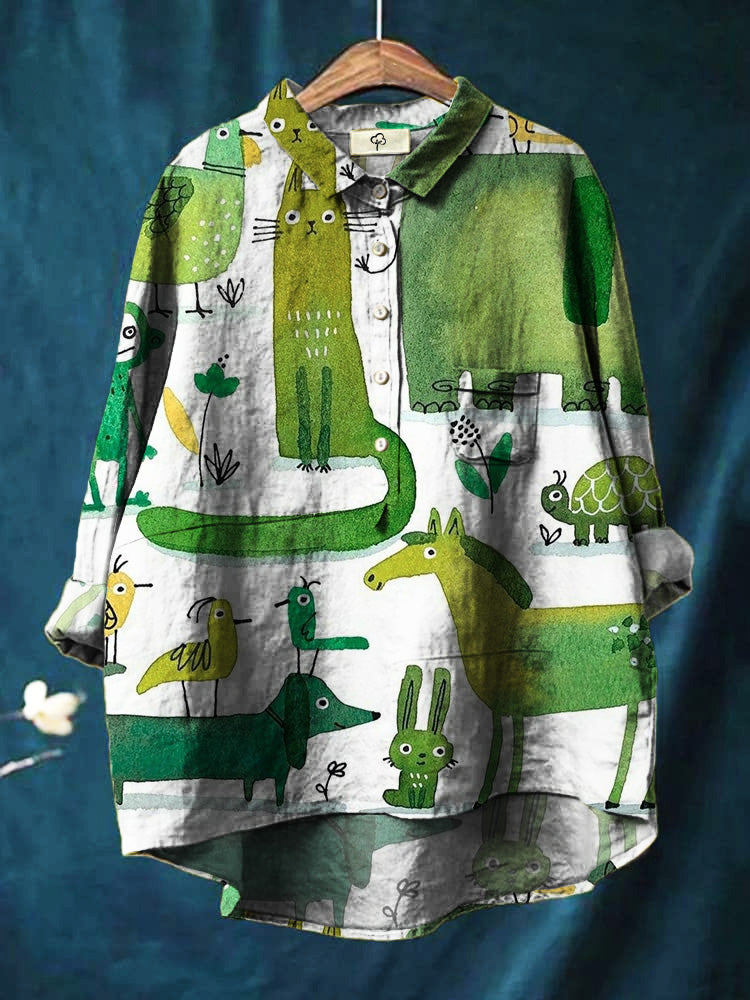 Cartoon Cute Animals Kitten Bird Dog Horse Turtle Print Cotton And Linen Shirt