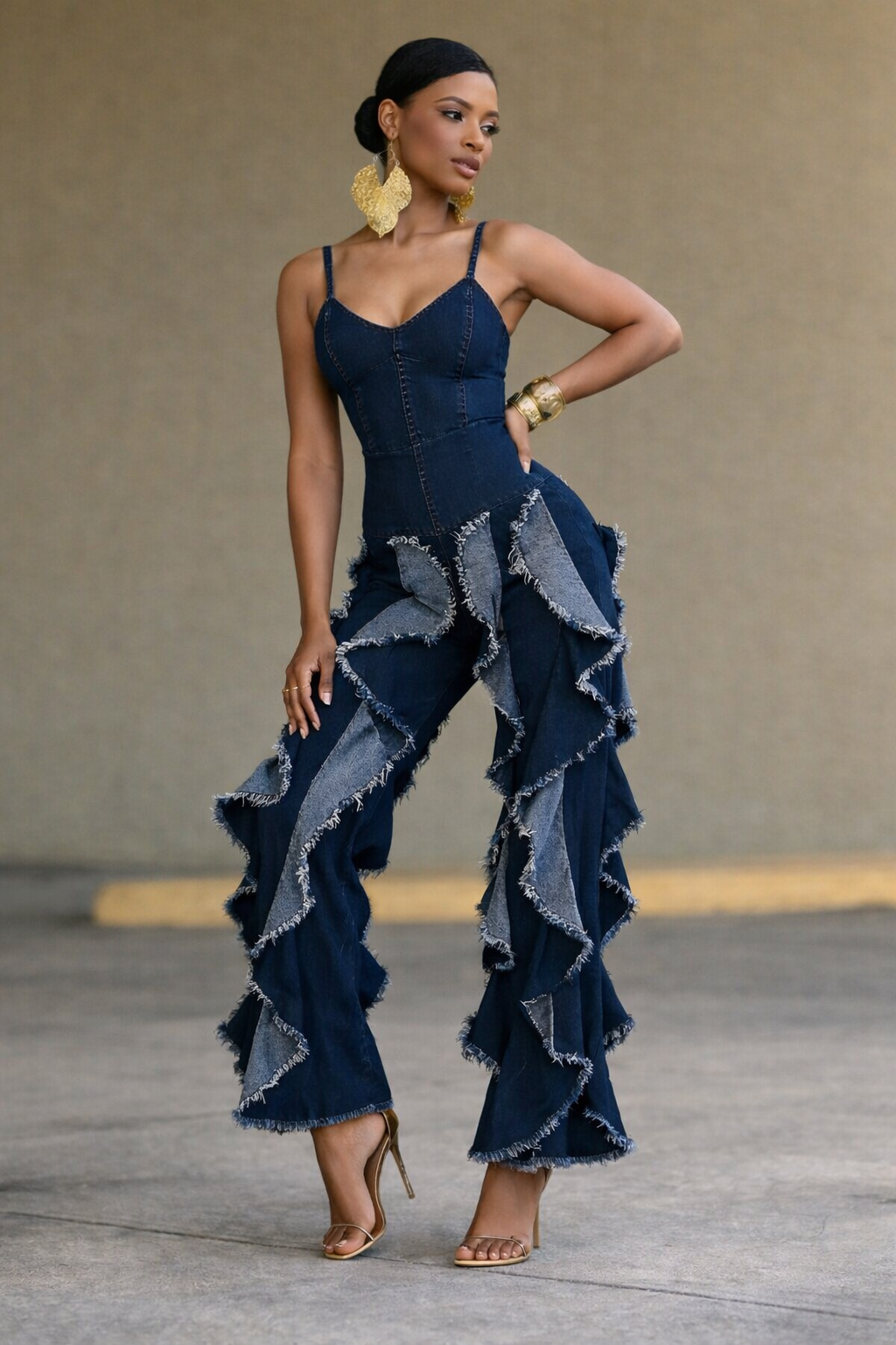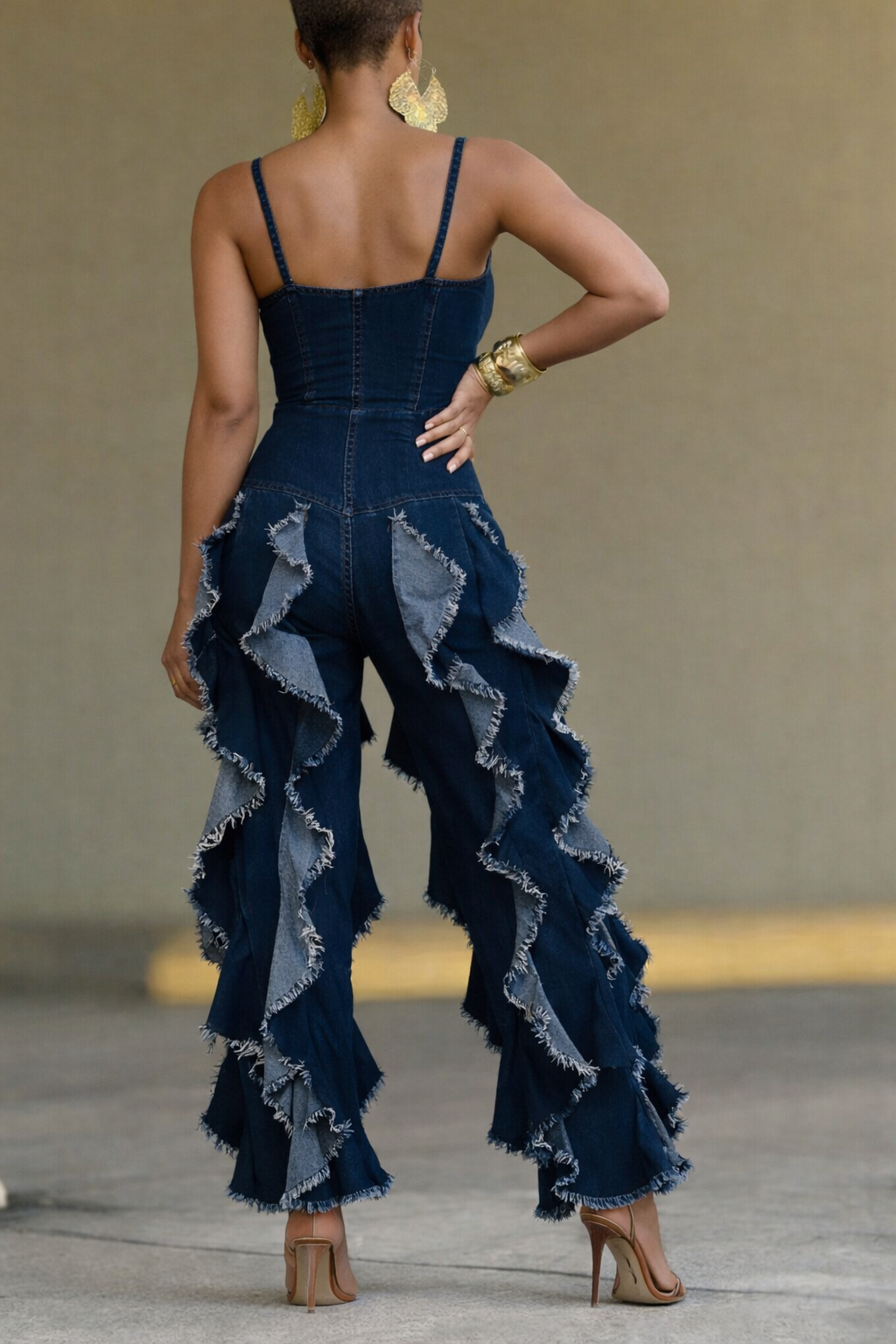 Dark Blue Denim Ruffle Wide Leg Jumpsuit