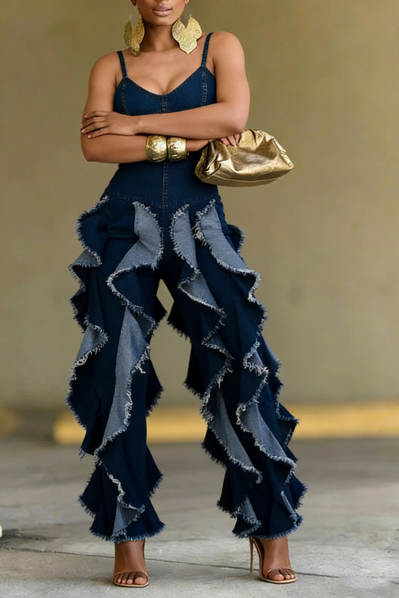 Design: Features a chic V-neck spaghetti strap bodice with visible contrast stitching, cinching your waist for a flattering silhouette. The wide-leg pants are adorned with layered ruffle panels in contrasting light and dark denim, finished with frayed edges for a bold, eye-catching look.