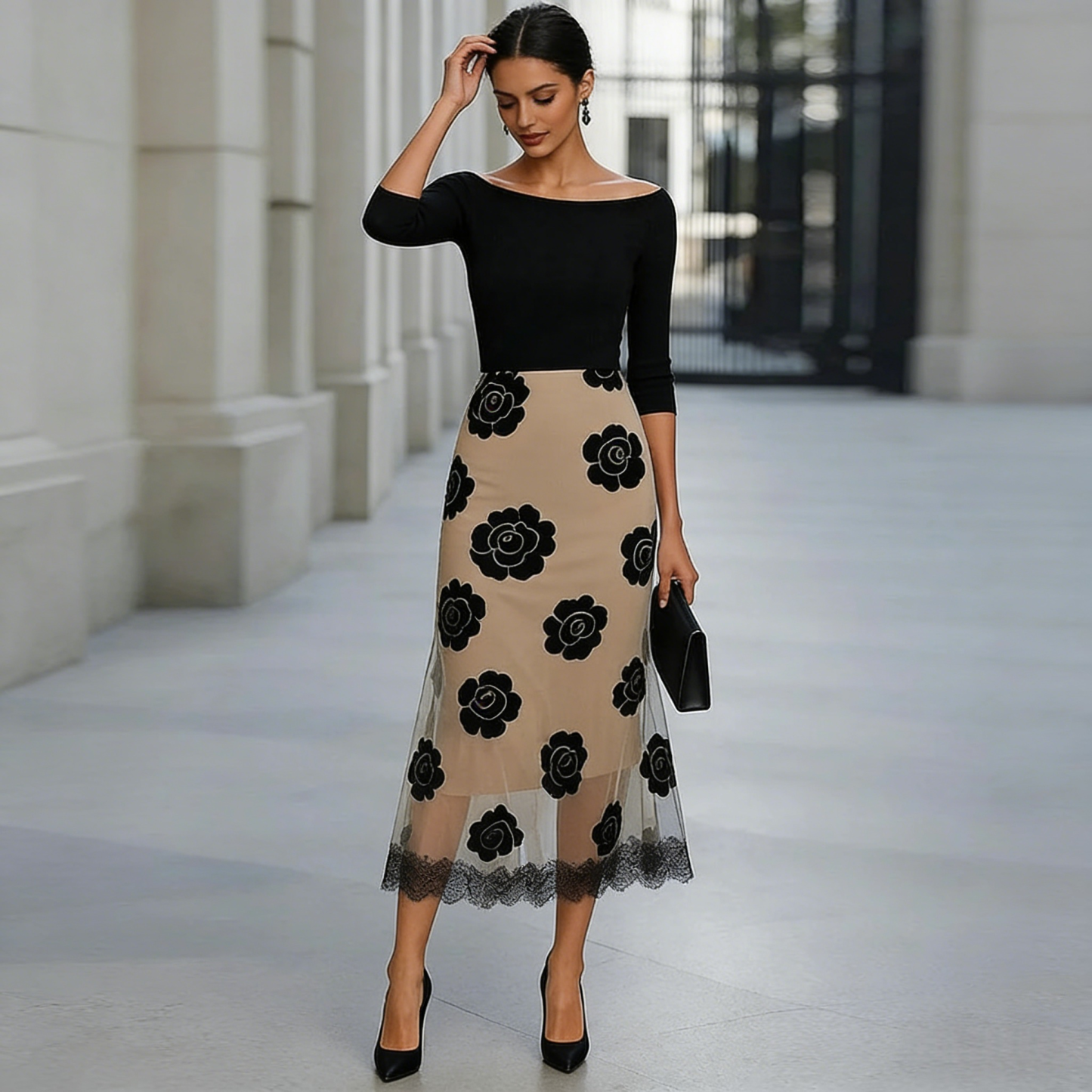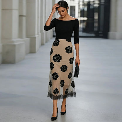 This elegant two-piece set features a fitted black off-the-shoulder top crafted from soft, high-stretch jersey and a structured high-waist midi skirt. The skirt is defined by bold black rose appliqués and a dramatic sheer mesh panel with a scalloped lace hem. Designed to be worn together for a seamless look or as versatile separates.