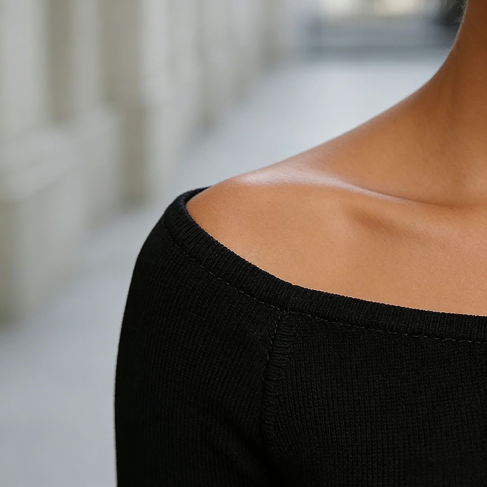 • Bardot Neckline: The fold-over off-the-shoulder top is designed to stay in place while framing the collarbones.