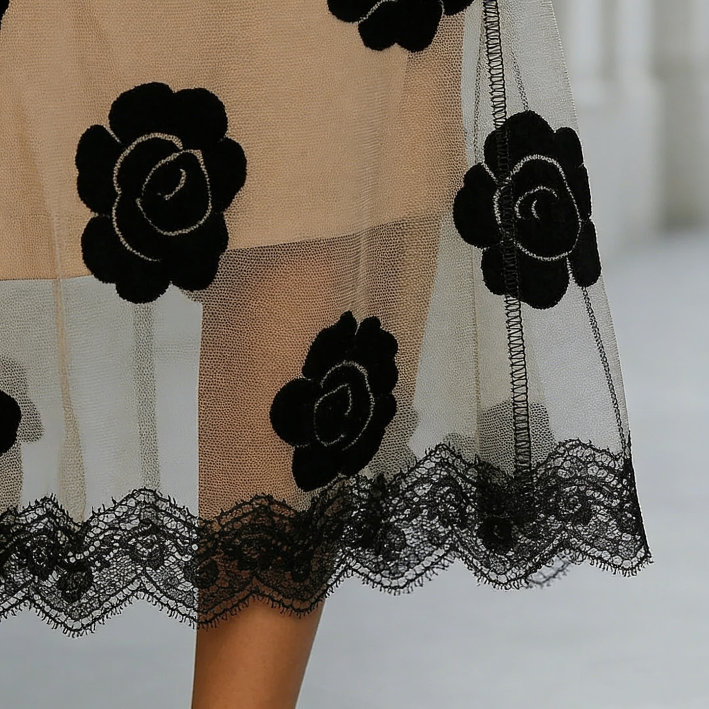 • Sheer Lace-Trimmed Hem: Architectural translucent mesh lower panel with intricate scalloped edging.