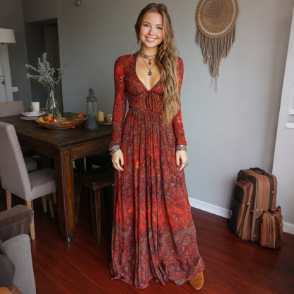 This paisley maxi dress is designed with a dramatic plunging deep V-neckline (a camisole or bralette is recommended for those preferring more coverage). Crafted from a lightweight, non-stretch fabric with a fluid drape, it features a high-waisted gathered bodice and fitted long sleeves that balance the voluminous, floor-sweeping skirt.