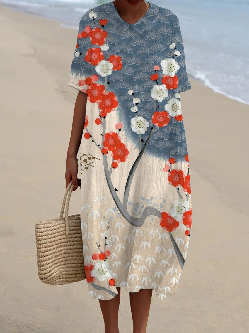 Japanese Floral Print Women's Lapel Pocket Short Sleeve Dress