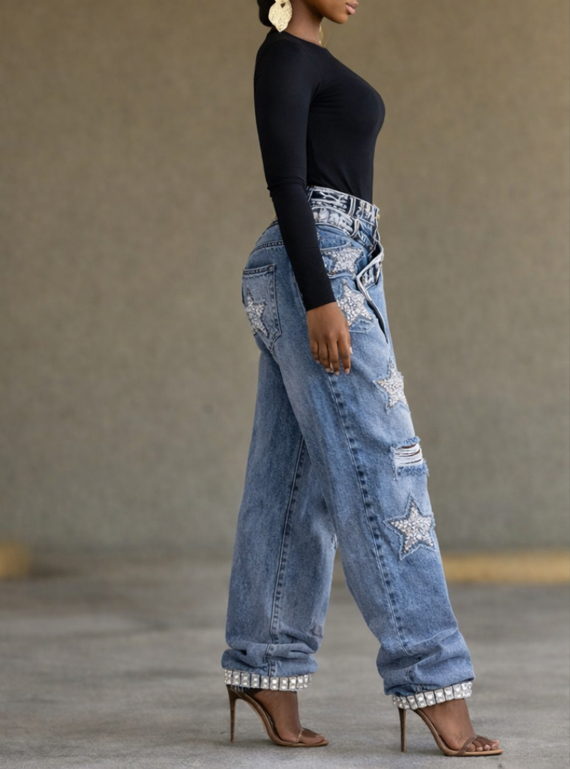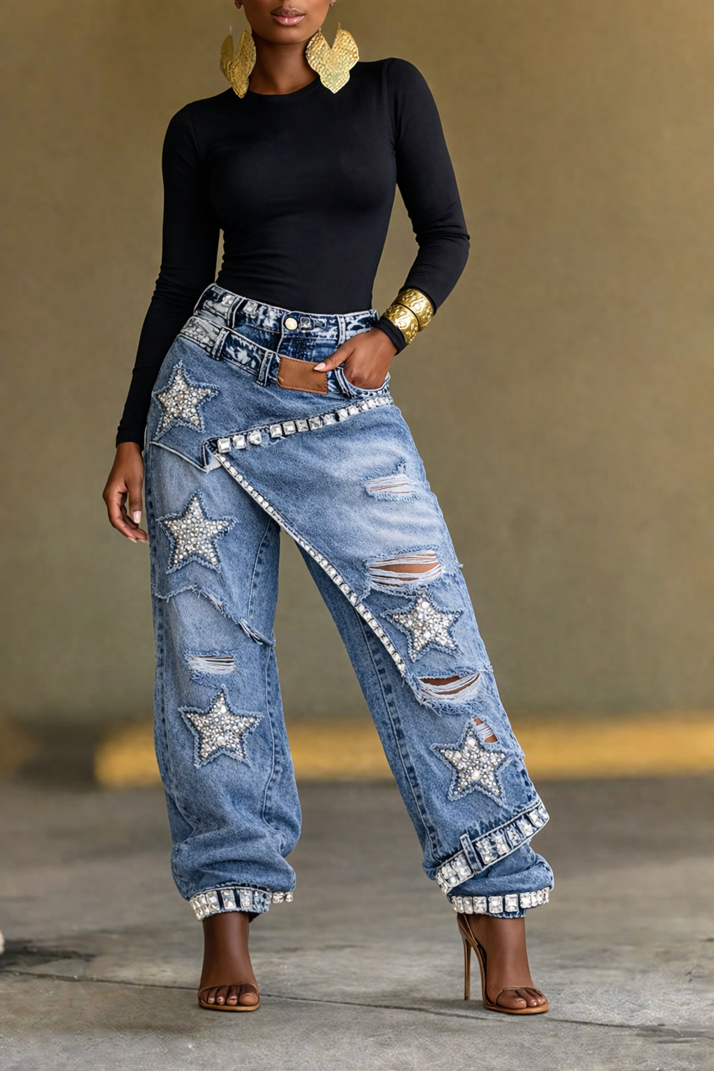 Material: Crafted from premium washed denim fabric, durable, breathable, with a comfortable, relaxed fit.Design: Features a high-waisted design with a double waistband, extensive ripped details, and sparkling rhinestone star appliqués and trim throughout, adding a glamorous, eye-catching finish.Fit: Oversized baggy wide-leg fit that flatters all body types.Occasion: Perfect for parties, festivals, street fashion, and glamorous casual outings.Care Instructions: Hand wash in cold water, line dry naturally, do not bleach, low iron if needed.