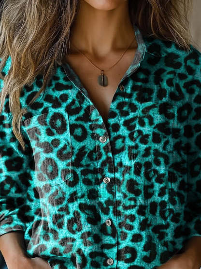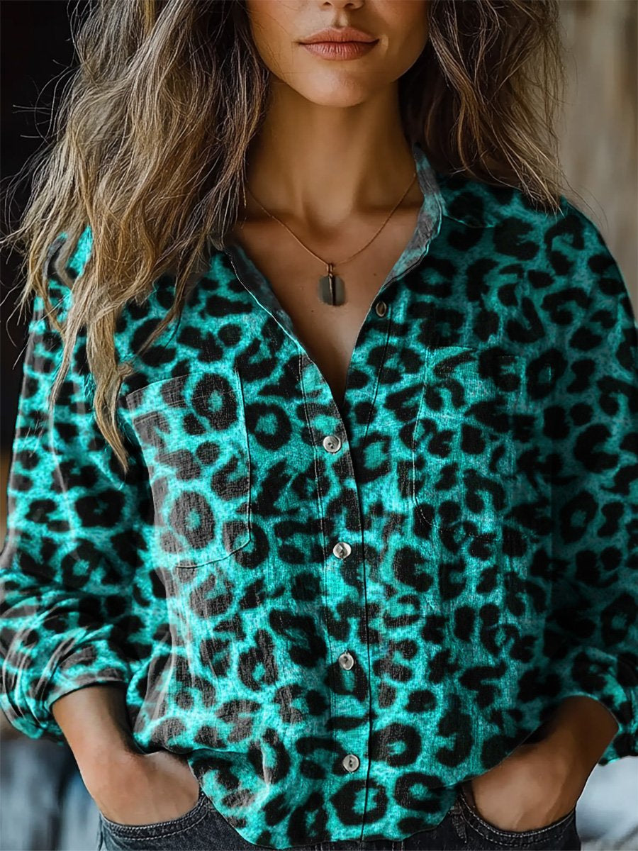Neon Color Leopard Pattern Printed Women's Casual Long Sleeve Comfortable Cotton Shirt