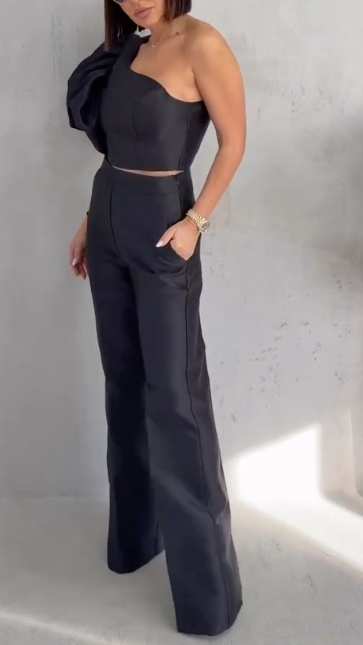 One Shoulder Puff Sleeve Crop Top & Straight Pants Two Piece Set