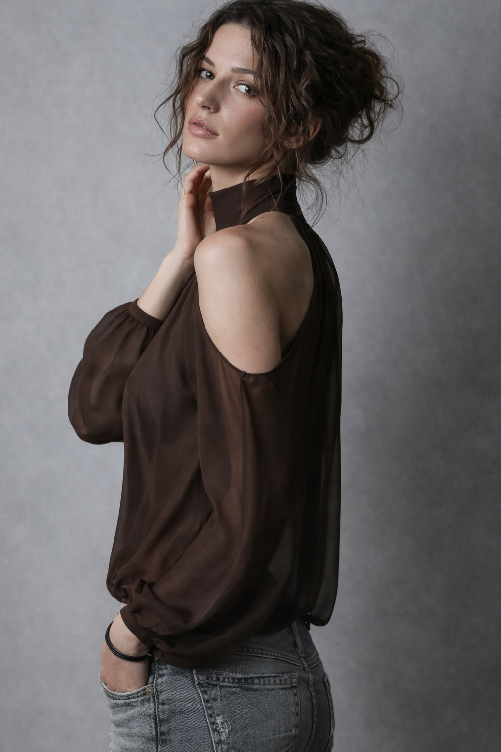 Chocolate Pleated Halter Crop Top with Flowing Lantern Sleeves