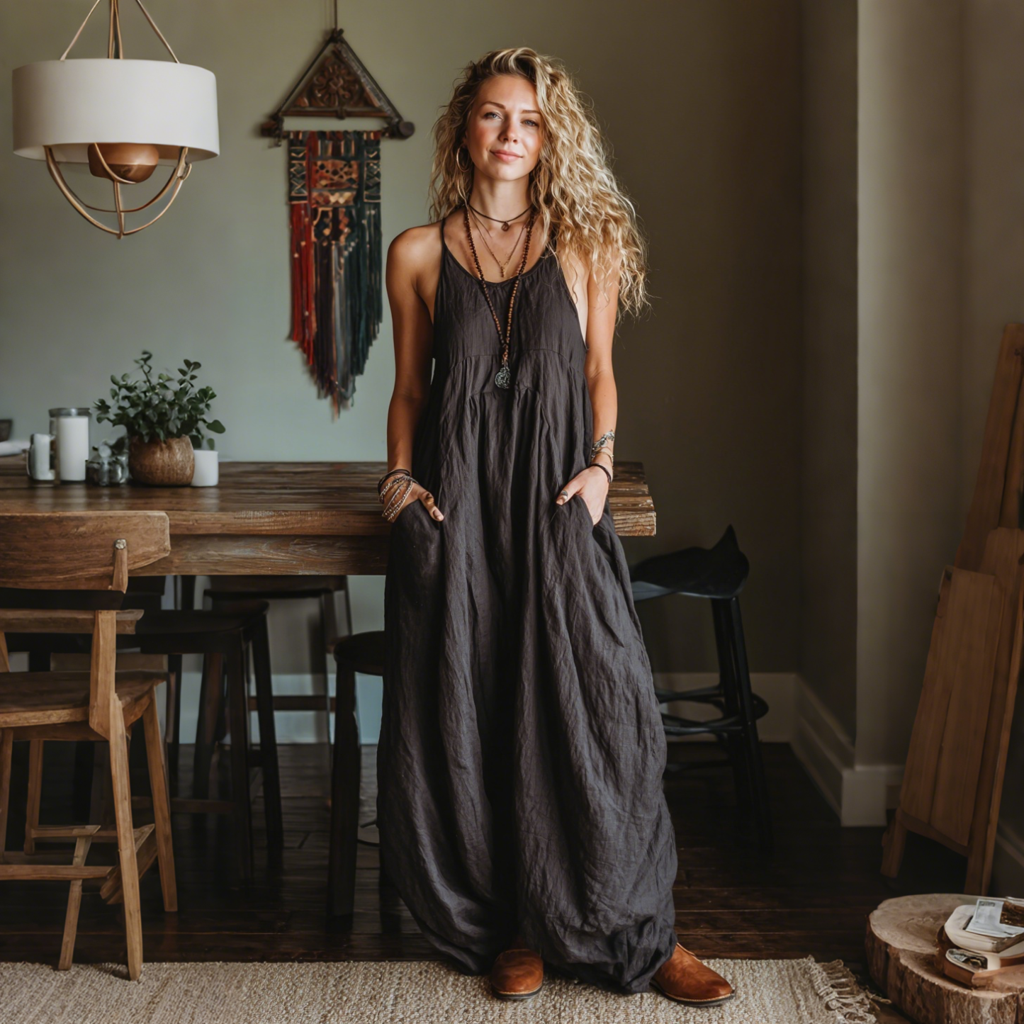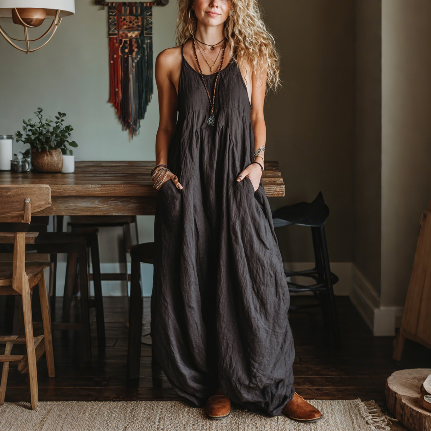 The long flowing silhouette creates a graceful, chic look, while side pockets provide convenient storage for small essentials. Pair with layered necklaces, ankle boots, or a cozy cardigan to enhance the vintage-boho charm and adapt seamlessly to cooler seasonal temperatures.
