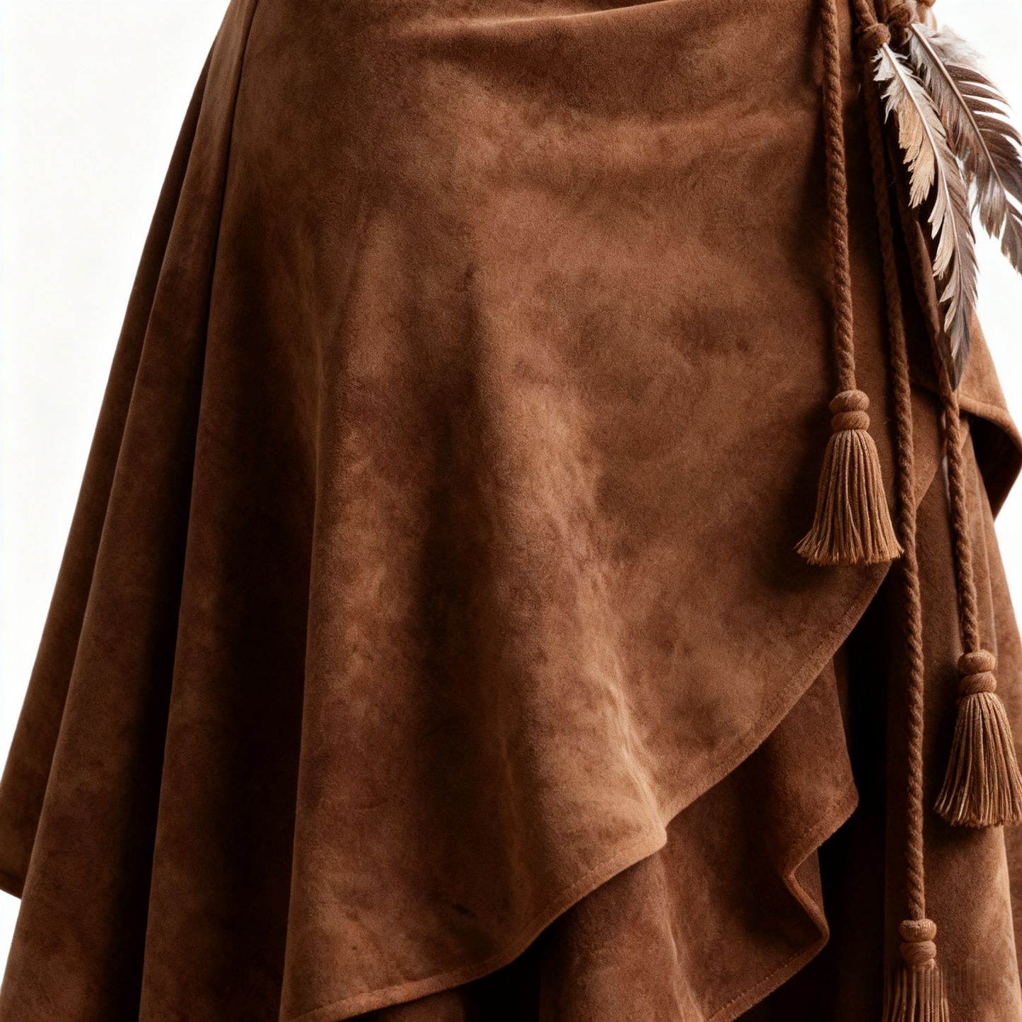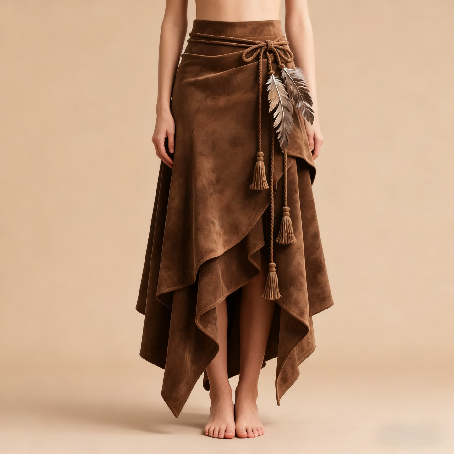 Step into effortless bohemian charm with this Retro Western-style suede skirt. Its asymmetric hemline brings modern flair, while tassel accents and delicate feather embellishments add a touch of exotic sophistication. Perfect for casual outings, festival vibes, or expressing your free-spirited style every day.