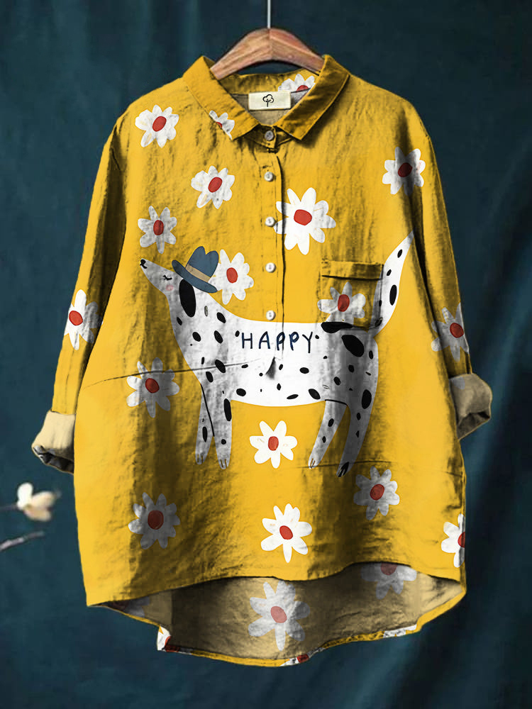 Simple Cartoon Spotted Dog With Daisy Print Cotton And Linen Shirt