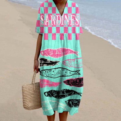Vintage Fish Sanrdinas Forever Art Printed Women's Flowy Dress