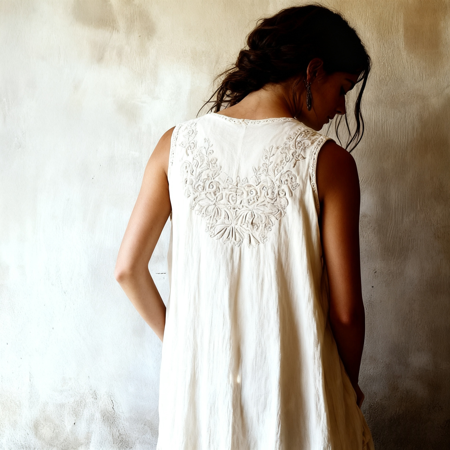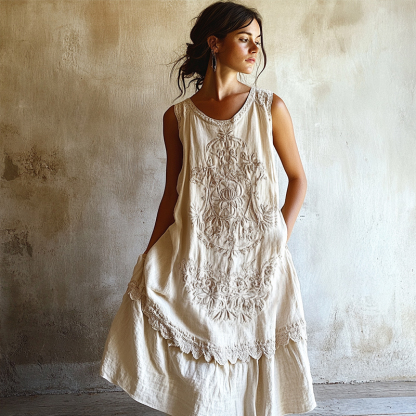Step into the quiet magic of slow living. This Embroidered Tank Dress is crafted from a premium cotton-linen blend that naturally textures and drapes with lived-in softness. It is designed to feel like a cherished heirloom from the very first wear.