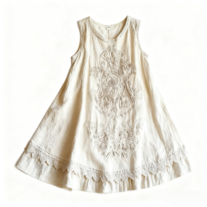 Vintage Floral Embroidered Linen Tank Dress | Scalloped Lace Hem