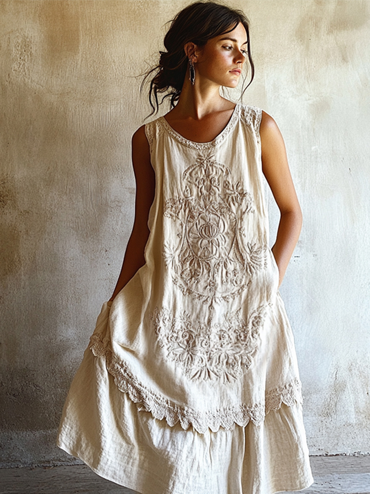 Vintage Floral Embroidered Linen Dress