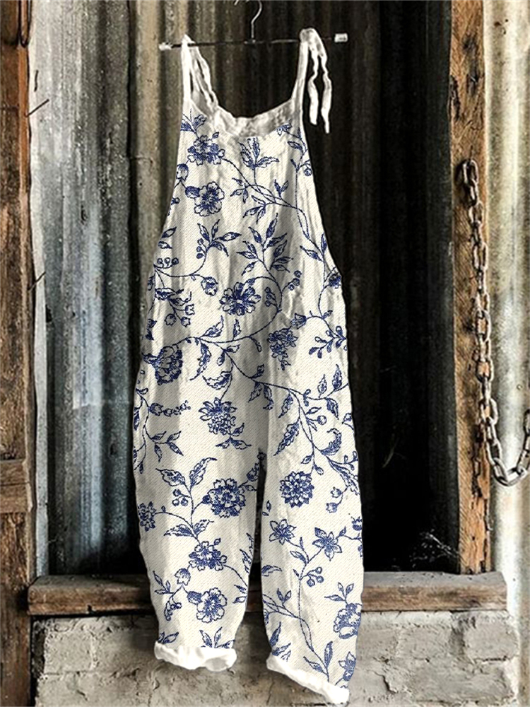 Women's Blue Floral Print Linen Blend Jumpsuit