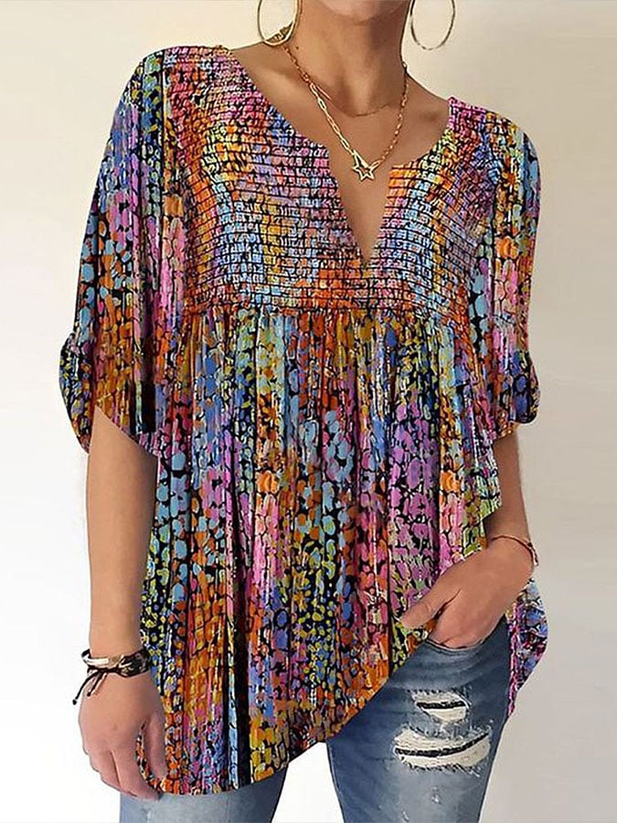 Women's Colorful Geometric Print V-Neck Top