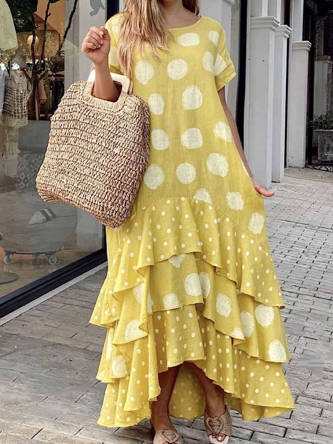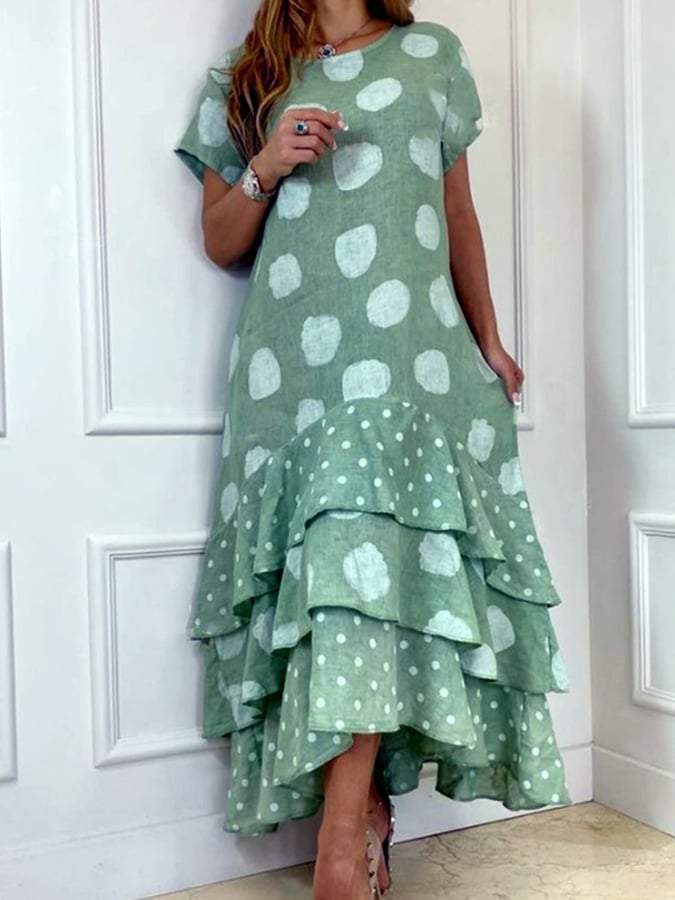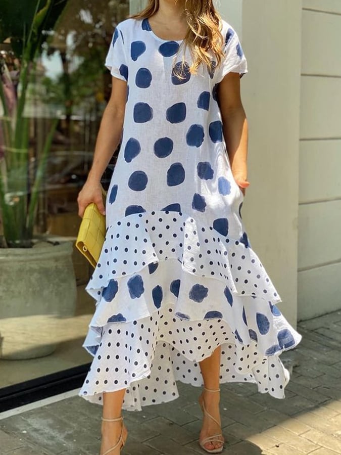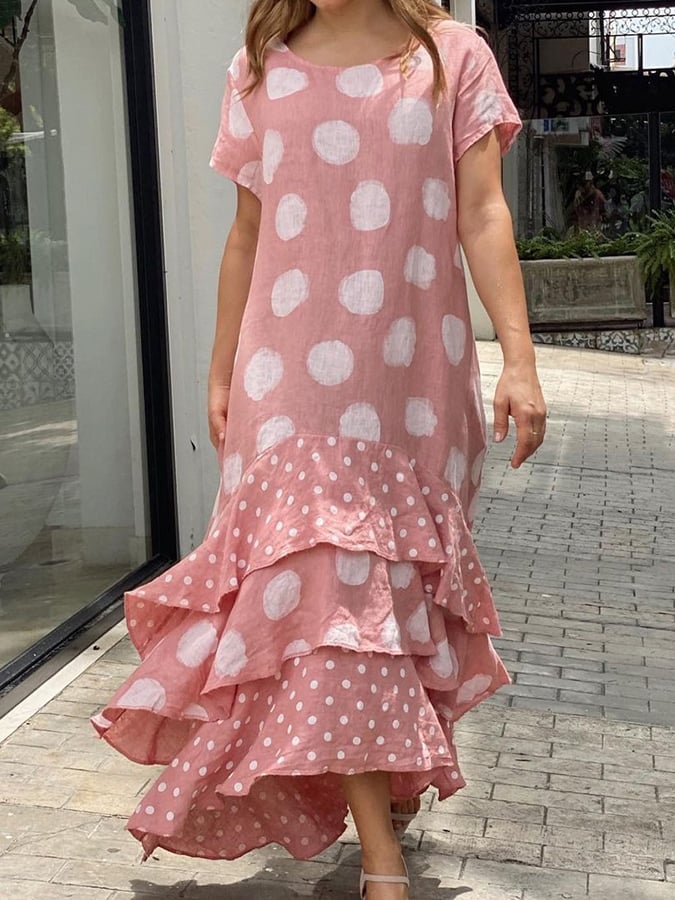 Women's Cotton Linen Polka Dot Print Panel Dress
