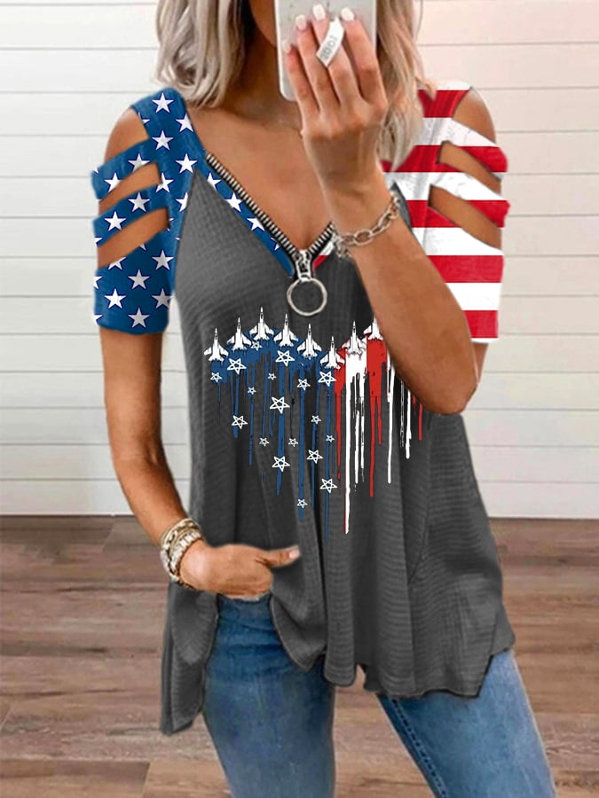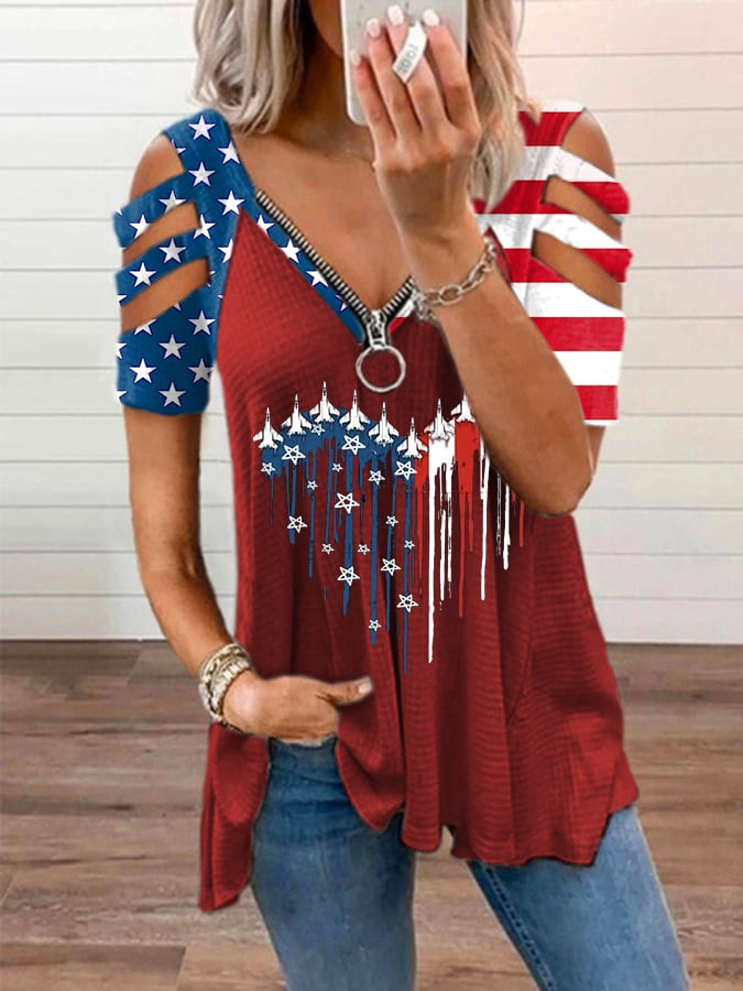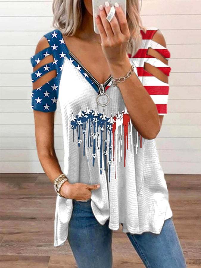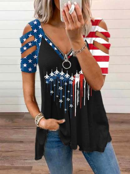 Women's Flag Printed V-Neck Zipper Casual T-Shirt