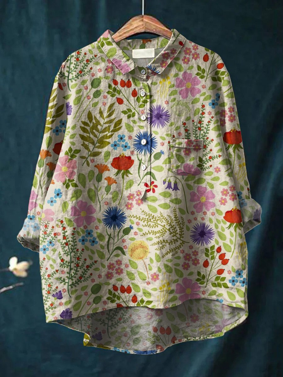 Women's Floral Art Print Casual Cotton And Linen Shirt