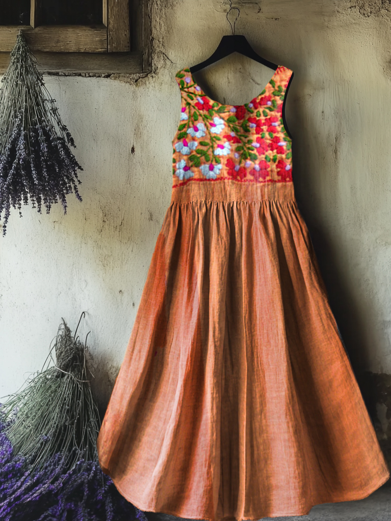 Women's Floral Art Print Round Neck Sleeveless Cotton Pocket Dresses