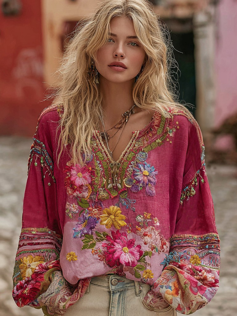 Women's Floral Embroidery Art Colorblock Linen Blend V-neck Boho Shirt