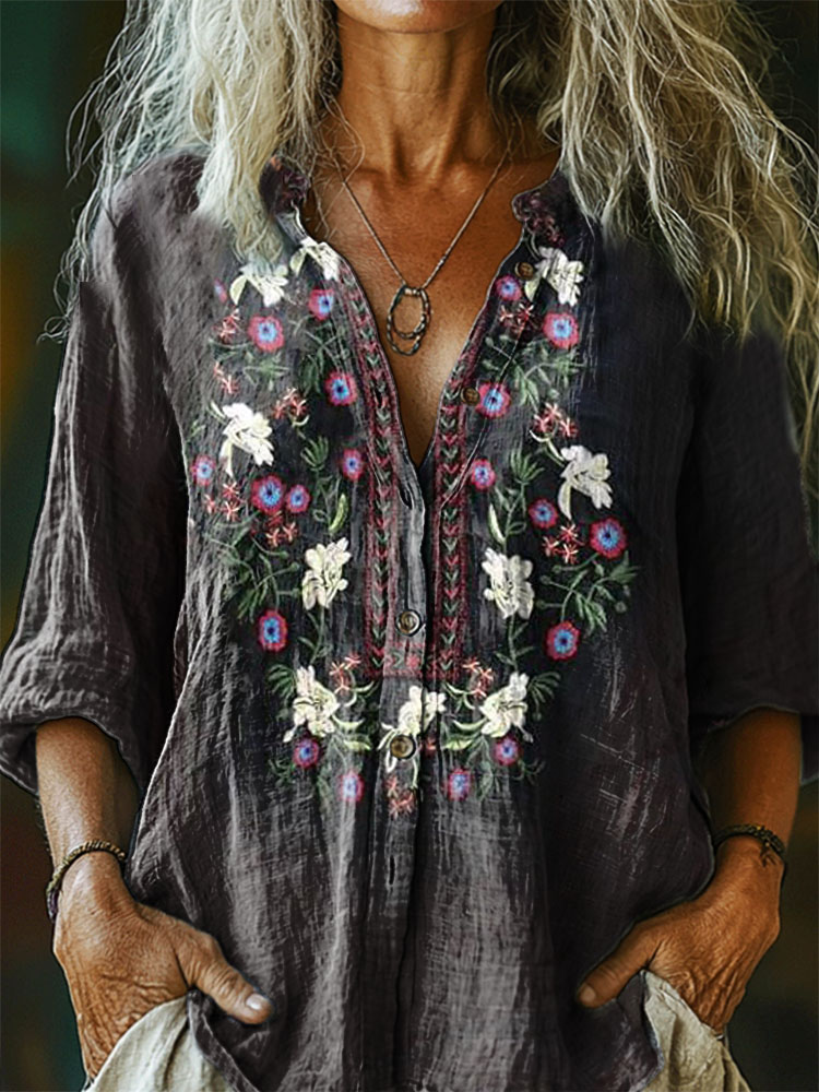 Women's Floral Pattern Art Print Casual Cotton Linen Shirt
