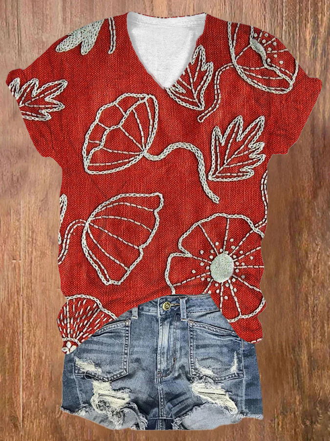 Women's Japanese Three-Dimensional Floral Embroidery Print T-Shirt