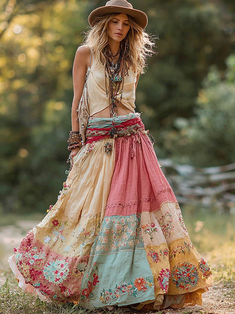 Women's Retro Floral Stitching Casual Skirt