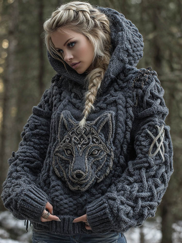 Women's Viking Celtic Wolf Knit Jacquard Warm Hooded Sweater