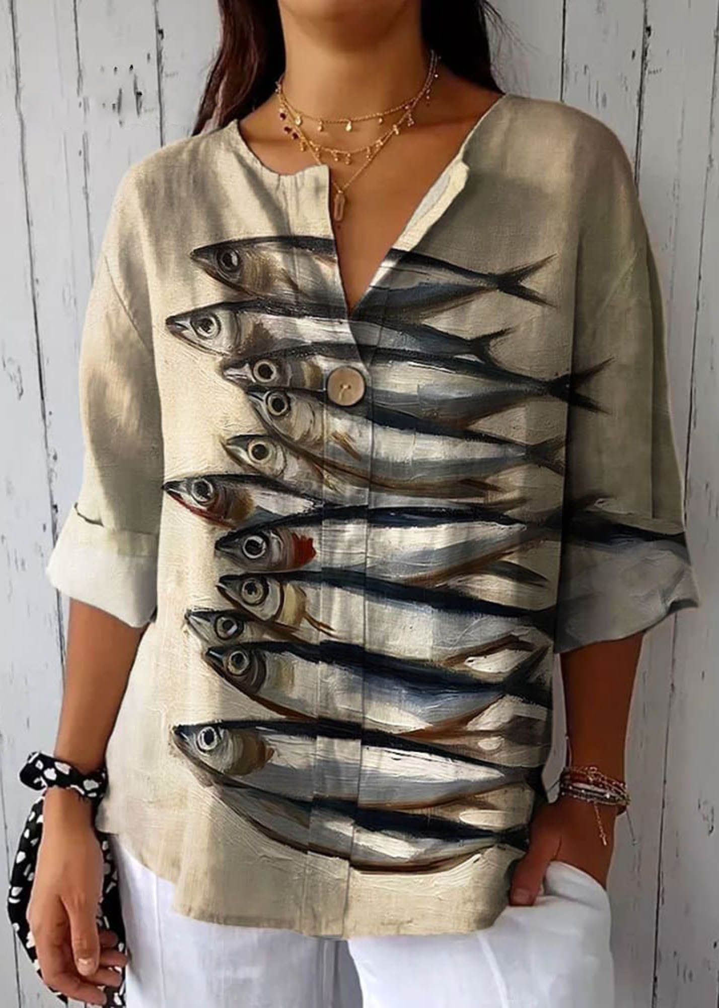 Women's Vintage Fish Art Print Casual Cotton Linen Shirt