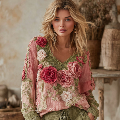 Women's Vintage Floral Art V-neck Shirt
